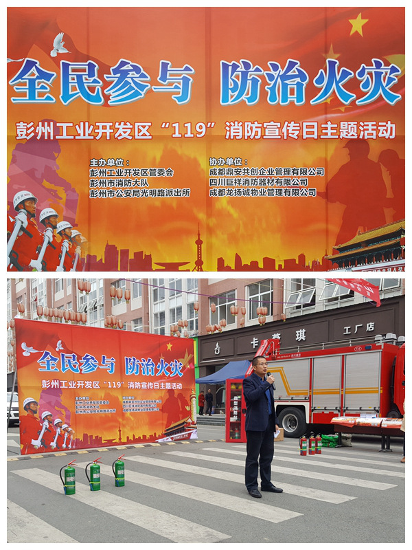 11月9日是我国的消防宣传日,为进一步增强企业和广大群众的消防安全意识,提高抵御火灾能力,预防火灾事故发生,确保人民的生命财产安全,今天上午,由彭州工业开发区管委会、彭州市消防大队、彭州市公安局光明路派出所主办,成都鼎安共创企业管理有限公司、四川巨祥消防器材有限公司、成都龙扬诚物业管理有限公司协办的彭州工业开发区管委会2018年度“119”消防宣传日主题活动在龙洋家纺服装园区举行。